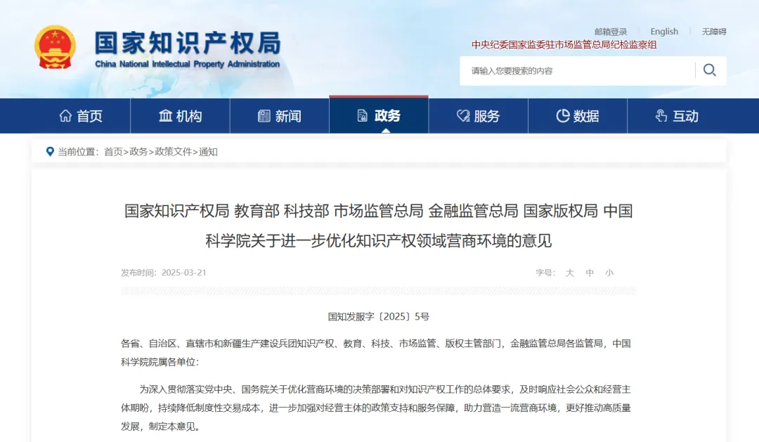 國(guó)家知識(shí)產(chǎn)權(quán)局 教育部 科技部 市場(chǎng)監(jiān)管總局 金融監(jiān)管總局 國(guó)家版權(quán)局 中國(guó)科學(xué)院關(guān)于進(jìn)一步優(yōu)化知識(shí)產(chǎn)權(quán)領(lǐng)域營(yíng)商環(huán)境的意見