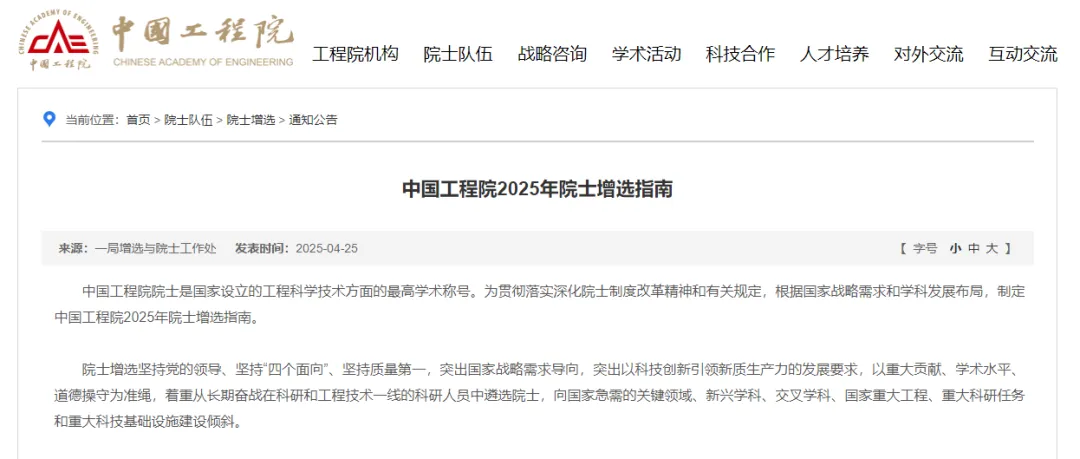 4月25日,中國工程院和中國科學(xué)院發(fā)布2025年院士增選指南,兩院院士增選工作正式啟動。