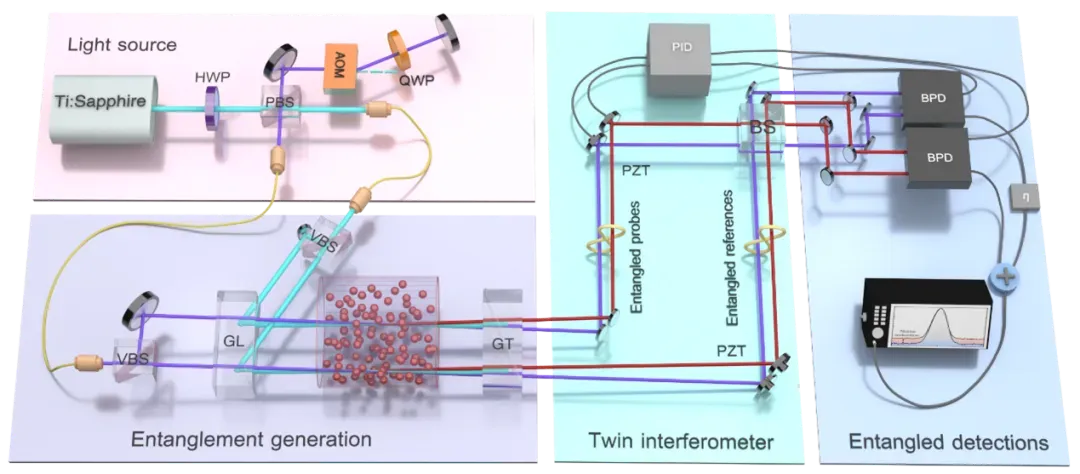 為突破此局限,團隊構(gòu)建了互為糾纏的“量子孿生干涉儀”,取代現(xiàn)有的平衡零拍探測?;诓⑿信渲玫碾p對孿生糾纏光束,團隊建立了量子關(guān)聯(lián)干涉與糾纏探測協(xié)同的相位測量新范式。這一成果成為量子計量學向前邁進的又一里程碑。