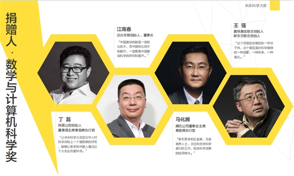 未來科學(xué)大獎(jiǎng)每個(gè)獎(jiǎng)項(xiàng)由4位捐贈(zèng)人共同捐贈(zèng),均為關(guān)注中國科技事業(yè)的企業(yè)家、投資人等自愿出資。
