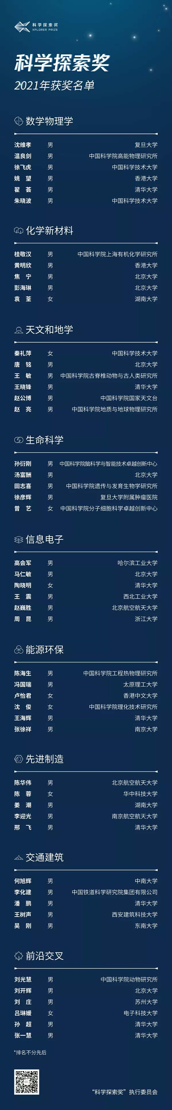 9月13日,2021年“科學(xué)探索獎(jiǎng)”獲獎(jiǎng)名單公布,50位青年科學(xué)家上榜。