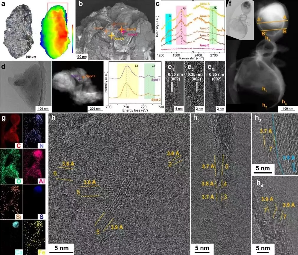 圖1 CE-5月壤樣品中天然石墨烯的先進(jìn)電子顯微結(jié)構(gòu)表征和譜學(xué)分析