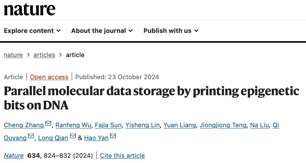 2024年10月23日,北京大學(xué)計算機學(xué)院張成與定量生物學(xué)中心錢瓏聯(lián)合研究團隊與合作者,在國際學(xué)術(shù)期刊Nature上發(fā)表題為“Parallel molecular data storage by printing epigenetic bits on DNA”的研究論文,首次提出了一種基于并行寫入策略的DNA存儲策略,成功將信息打印在DNA分子之上,猶如“活字印刷”,在白紙上批量印刷信息。團隊在實驗中,成功將中國漢代“白虎”瓦當(dāng)和大熊貓的高清圖片(數(shù)據(jù)量超過27.5萬比特)寫入DNA分子中,并無損還原了原始數(shù)據(jù),解析出高清圖片。