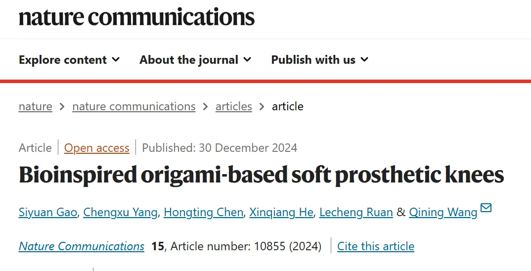 北京大學(xué)工學(xué)院先進(jìn)制造與機(jī)器人系王啟寧教授課題組在智能動(dòng)力下肢假肢方面取得重要突破,提出一種受馬尾草啟發(fā)的折紙軟體動(dòng)力膝關(guān)節(jié)假肢,這是國(guó)際首款軟體膝關(guān)節(jié)假肢。研究為下肢假肢的設(shè)計(jì)提供了全新的思路,研究成果以“Bioinspired Origami-based Soft Prosthetic Knee”為題,于近日發(fā)表在國(guó)際重要期刊Nature Communications上。該論文的第一作者為北京大學(xué)工學(xué)院博士生高思源,王啟寧教授為唯一通訊作者。