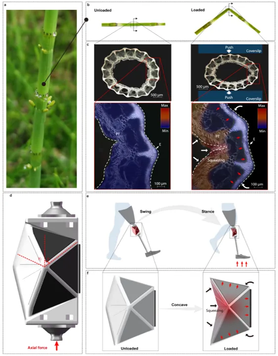 馬尾草是一種常見(jiàn)的具有管狀結(jié)構(gòu)的植物,這種植物有些可以長(zhǎng)到5米高,但是只有2厘米粗,如圖4所示,通過(guò)對(duì)其莖的截?cái)嗝孢M(jìn)行觀察,可以看到一個(gè)由薄的外環(huán)強(qiáng)化組織和更厚的內(nèi)環(huán)軟組織組成的結(jié)構(gòu),在馬尾草被彎折的時(shí)候,外環(huán)形成的管狀結(jié)構(gòu)受擠壓,使得內(nèi)部軟組織細(xì)胞內(nèi)壓上升,從而提高結(jié)構(gòu)剛度抵抗彎折。進(jìn)一步觀察可以發(fā)現(xiàn),在髓腔生長(zhǎng)過(guò)程中,管狀結(jié)構(gòu)內(nèi)壁上會(huì)形成褶皺結(jié)構(gòu),在結(jié)構(gòu)應(yīng)力最集中的部位,褶皺處會(huì)進(jìn)一步凹陷,擠壓局部細(xì)胞,使細(xì)胞內(nèi)壓進(jìn)一步上升,從而提高局部結(jié)構(gòu)強(qiáng)度。由此,本研究總結(jié)出馬尾草抗彎折的兩大關(guān)鍵機(jī)制,即流體壓制穩(wěn)定和受壓內(nèi)凹結(jié)構(gòu)。