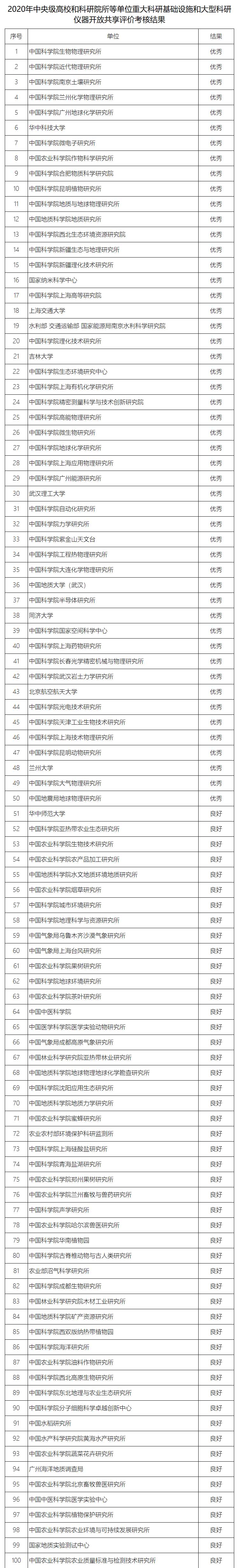 附件:2020年中央級(jí)高校和科研院所等單位重大科研基礎(chǔ)設(shè)施和大型科研儀器開放共享評(píng)價(jià)考核結(jié)果