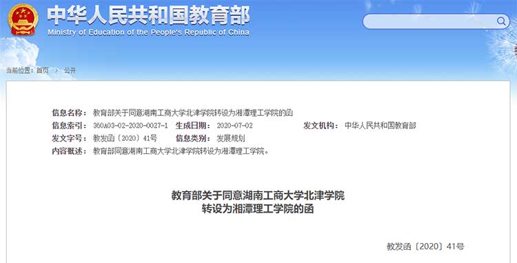 6月30日,教育部發(fā)布《教育部關于同意湖南工商大學北津學院轉設為湘潭理工學院的函》。文件指出,經(jīng)教育部黨組會議研究決定,同意湖南工商大學北津學院轉設為湘潭理工學院,同時撤銷湖南工商大學北津學院的建制。