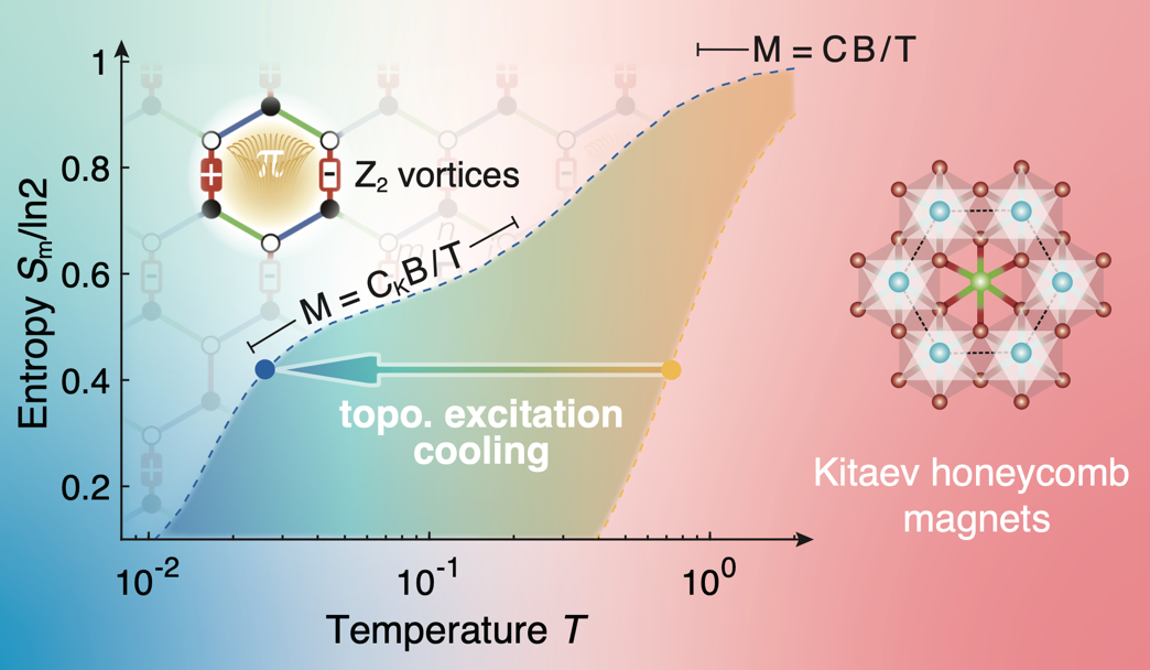 阻挫量子磁體通常具備較高的磁性離子密度、強烈的自旋漲落以及磁激發(fā)帶來的增強熱導(dǎo)等,并且材料結(jié)構(gòu)穩(wěn)定,可作為新型的磁制冷工質(zhì),有望實現(xiàn)極低溫的固態(tài)制冷。吉塔耶夫量子自旋液體由于阻挫效應(yīng)與量子漲落的共同作用,即便在遠低于相互作用能標的低溫甚至零溫時也不會形成磁有序,其低能拓撲激發(fā)會攜帶巨大的低溫熵,通過外場的有效調(diào)控能夠?qū)崿F(xiàn)顯著的磁卡效應(yīng),進而實現(xiàn)拓撲激發(fā)極低溫制冷,這為探索新型固態(tài)制冷機制開辟了一條新途徑。