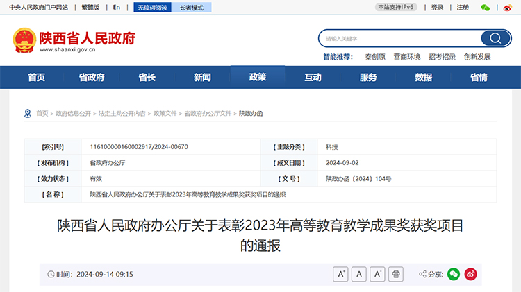 近日,陜西省人民政府公布了2023年陜西省高等教育教學(xué)成果獎評選結(jié)果。