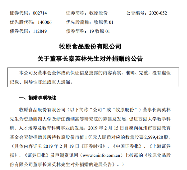 2019年2月15日秦英林自愿向杭州市西湖教育基金會(huì)無償捐贈(zèng)其所持牧原股份市值1億元人民幣對(duì)應(yīng)數(shù)量的股票259.9萬股。
