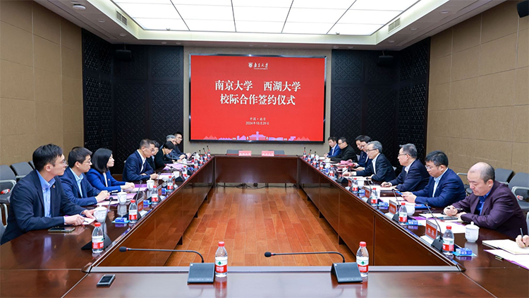 10月29日,西湖大學(xué)校長(zhǎng)、中國(guó)科學(xué)院院士施一公率學(xué)校代表團(tuán)一行來(lái)南京大學(xué)仙林校區(qū)調(diào)研座談,雙方簽署校際合作框架協(xié)議,攜手開(kāi)啟合作新篇章。南京大學(xué)校長(zhǎng)、中國(guó)科學(xué)院院士談?wù)苊舫鱿顒?dòng)并致辭。南京大學(xué)黨委副書(shū)記陳云松主持儀式。