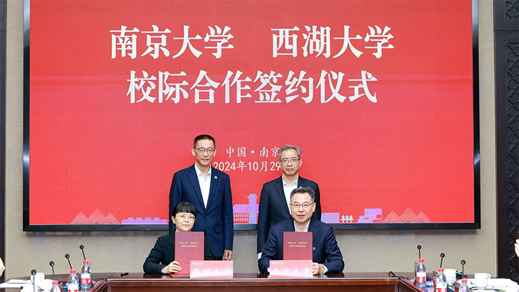 南京大學(xué)黨委常委、副校長(zhǎng)王振林,西湖大學(xué)副校長(zhǎng)、學(xué)校秘書(shū)長(zhǎng)朱曉蕓代表雙方簽署校際合作框架協(xié)議。