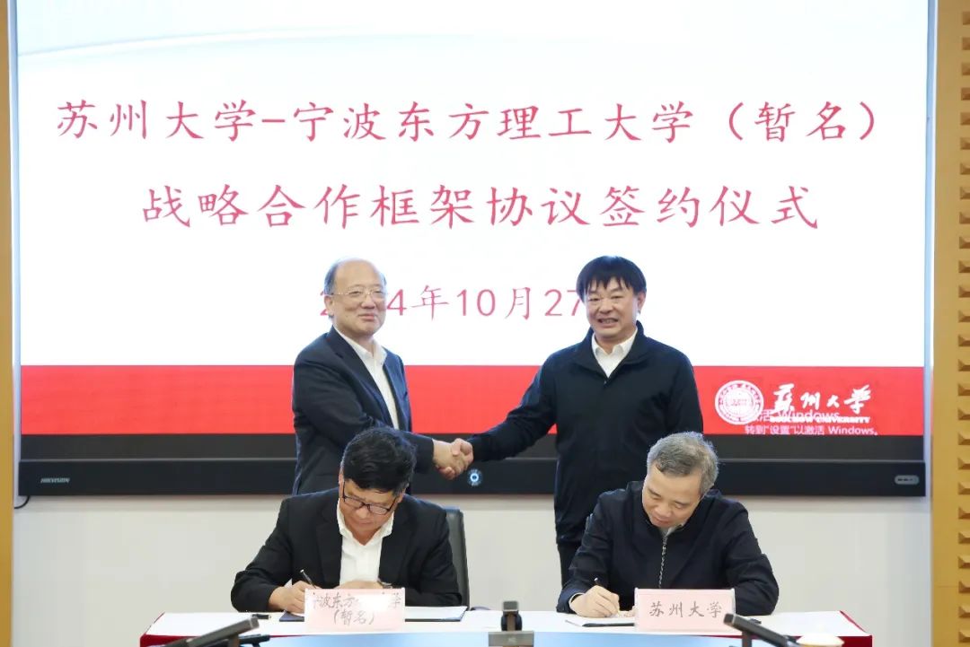 10月27日,寧波東方理工大學(xué)(暫名)與蘇州大學(xué)戰(zhàn)略合作框架協(xié)議簽訂儀式在蘇州大學(xué)天賜莊校區(qū)舉行,雙方將在科研合作、師資隊(duì)伍建設(shè)、學(xué)生交流、博士生聯(lián)合培養(yǎng)等方面推動(dòng)合作,服務(wù)國家戰(zhàn)略,助力創(chuàng)新驅(qū)動(dòng)發(fā)展。中國科學(xué)院院士、我校校長陳十一,中國工程院院士、蘇州大學(xué)校長應(yīng)漢杰出席儀式并講話,寧波東方理工大學(xué)(暫名)副校長鄭春苗與蘇州大學(xué)副校長沈明榮代表雙方簽約。蘇州大學(xué)副校長姚建林出席此次簽約儀式。