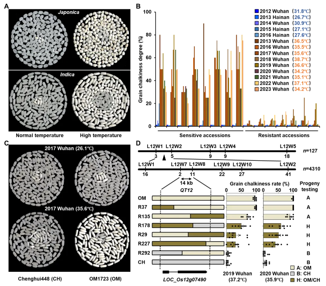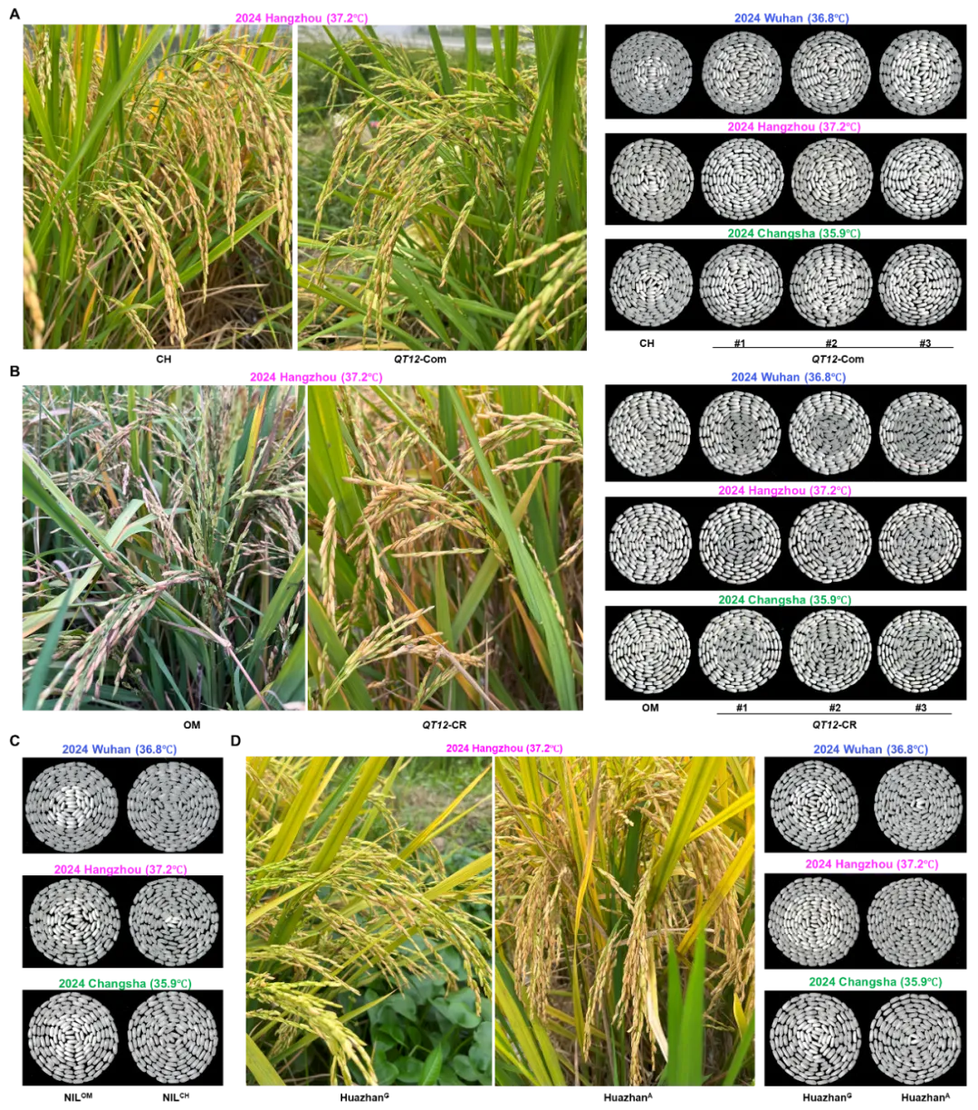 在這項(xiàng)研究中,經(jīng)過(guò)長(zhǎng)達(dá)10余年的灌漿期田間自然高溫抗性種質(zhì)的大量篩選和鑒定,研究團(tuán)隊(duì)利用自主研發(fā)的快速、高通量克隆作物重要農(nóng)藝性狀功能基因的RapMap方法(Zhang et al. NC, 2021),從大田耐熱水稻種質(zhì)中克隆到首個(gè)調(diào)控品質(zhì)耐高溫的主效QTL基因QT12,該基因同時(shí)表現(xiàn)出優(yōu)異的產(chǎn)量耐熱性。這一發(fā)現(xiàn)突破了傳統(tǒng)溫室篩選、苗期鑒定方法不能反映真實(shí)環(huán)境的局限,解決了長(zhǎng)期困擾科學(xué)界的“耐高溫表型難鑒定、耐高溫基因難應(yīng)用”的瓶頸問(wèn)題。