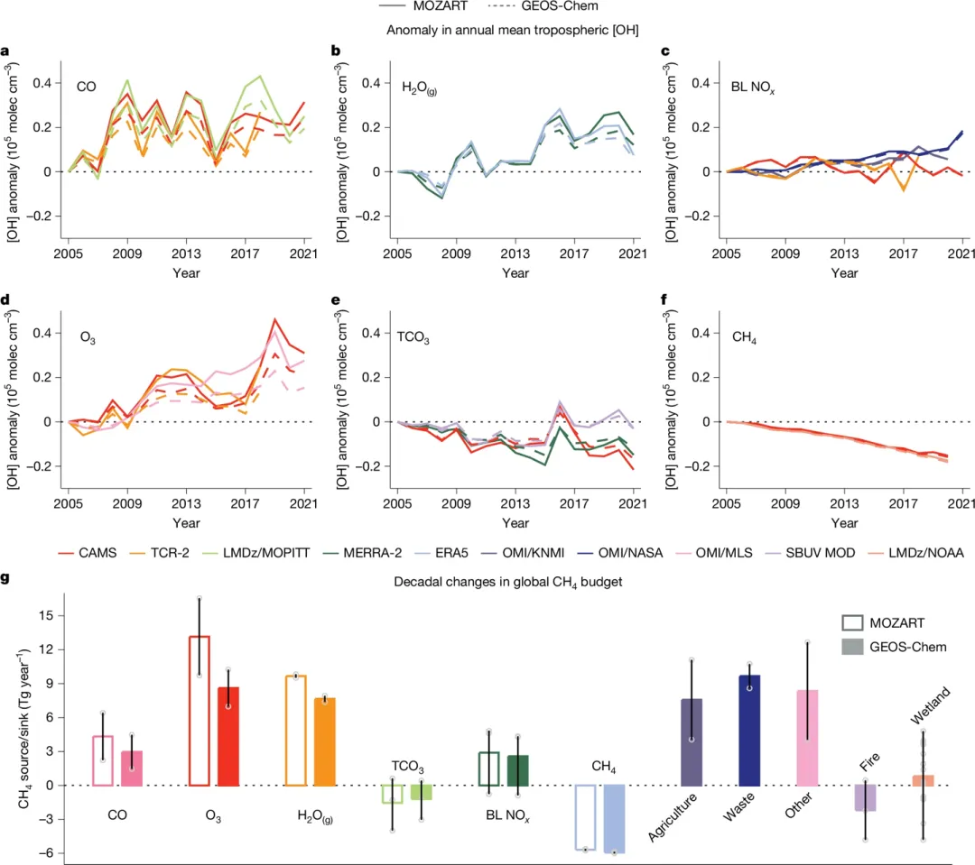 甲烷作為全球第二大溫室氣體,大氣中甲烷濃度的快速上升已成為氣候變暖的重要推動力,準確理解甲烷源匯過程及其調(diào)控機制是開展氣候變化治理的關(guān)鍵。大氣中羥基(OH)自由基是甲烷最主要的匯,當前對其濃度水平及時空變化趨勢的認知尚不清晰,對影響全球OH自由基變化的主控因子理解不足,制約了對甲烷濃度增長速率年際變率的準確理解。為解決這一問題,研究團隊自主研發(fā)了基于模型與數(shù)據(jù)雙驅(qū)動的全球大氣OH自由基量化表征系統(tǒng),系統(tǒng)量化了2005-2021年間臭氧(O3)、一氧化碳(CO)等主要大氣污染物對OH自由基和甲烷匯的影響。研究結(jié)果揭示了大氣污染物調(diào)控OH自由基濃度水平及其時空變化,進而影響全球甲烷源匯收支的關(guān)鍵機制,闡明了近年來大氣污染物在長期趨勢上減緩甲烷增長,在特定時段推動甲烷濃度異常波動的復雜機制。