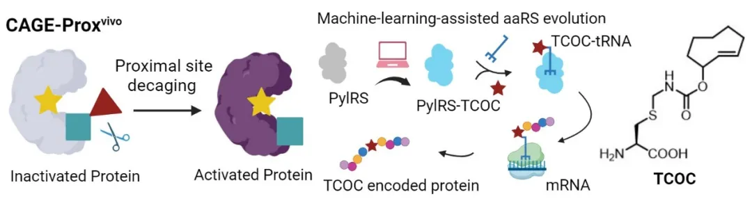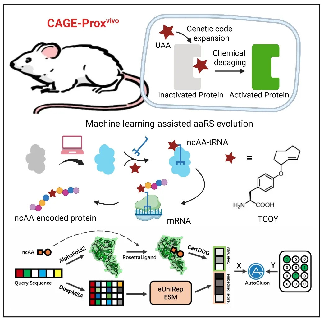 機(jī)器學(xué)習(xí)驅(qū)動(dòng)的蛋白質(zhì)活體激活策略:通過(guò)蛋白語(yǔ)言模型訓(xùn)練機(jī)器學(xué)習(xí)算法,設(shè)計(jì)和篩選tRNA合成酶(PylRS)變體,實(shí)現(xiàn)了可化學(xué)脫籠的反式環(huán)辛烯-酪氨酸(TCOY)的識(shí)別和編碼表達(dá),用于后續(xù)在體蛋白質(zhì)功能激活和互作調(diào)控