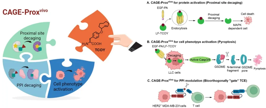 該工作通過(guò)機(jī)器學(xué)習(xí)與生物正交剪切反應(yīng)融合驅(qū)動(dòng),獲得了一種創(chuàng)新的蛋白質(zhì)原位激活平臺(tái)技術(shù)CAGE-Proxvivo,能夠在活體動(dòng)物中瞬時(shí)激活目標(biāo)蛋白質(zhì)的功能,并精確調(diào)節(jié)蛋白-蛋白相互作用。此外,CAGE-Proxvivo還可以調(diào)節(jié)細(xì)胞表型,誘導(dǎo)腫瘤細(xì)胞發(fā)生焦亡,增強(qiáng)抗腫瘤免疫響應(yīng)。