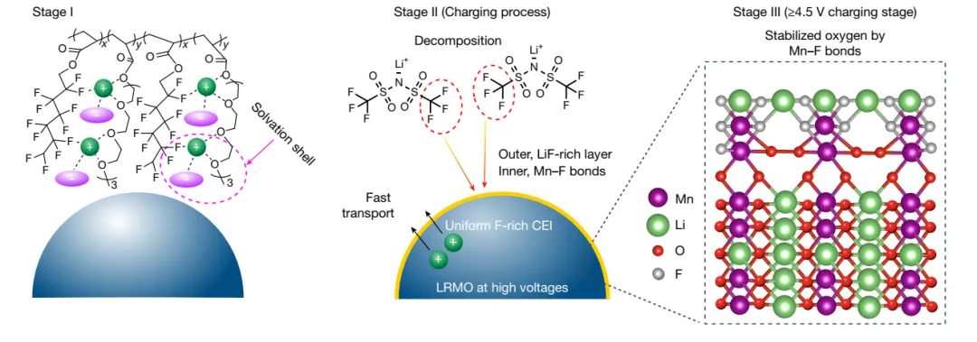 針對(duì)以上挑戰(zhàn),研究團(tuán)隊(duì)提出了“富陰離子溶劑化結(jié)構(gòu)”設(shè)計(jì)新策略,成功開發(fā)出一種新型含氟聚醚電解質(zhì)。該電解質(zhì)有效增強(qiáng)了固態(tài)界面的物理接觸與離子傳導(dǎo)能力,并顯著提升了界面穩(wěn)定性。