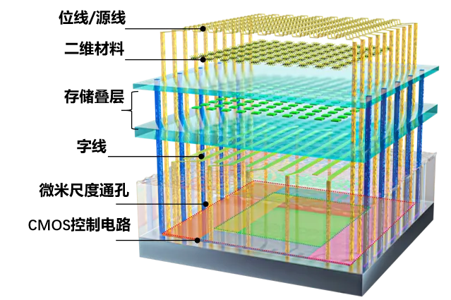 二維-硅基混合架構(gòu)閃存芯片結(jié)構(gòu)示意圖,包含二維模塊、CMOS控制電路和微米尺度通孔