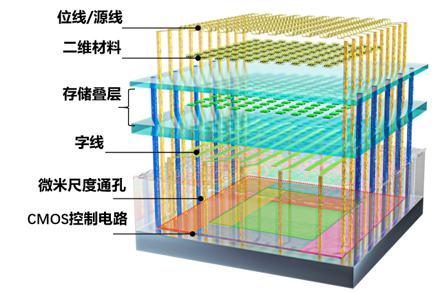 二維-硅基混合架構(gòu)閃存芯片結(jié)構(gòu)示意圖,包含二維模塊、CMOS控制電路和微米尺度通孔