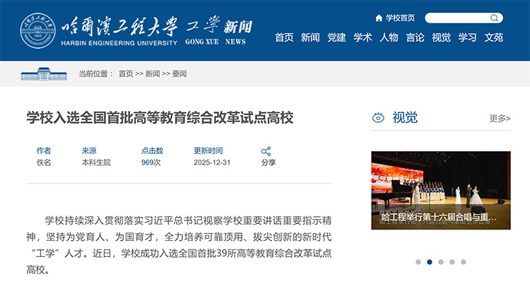 近日,哈爾濱工程大學(xué)成功入選全國首批39所高等教育綜合改革試點高校。