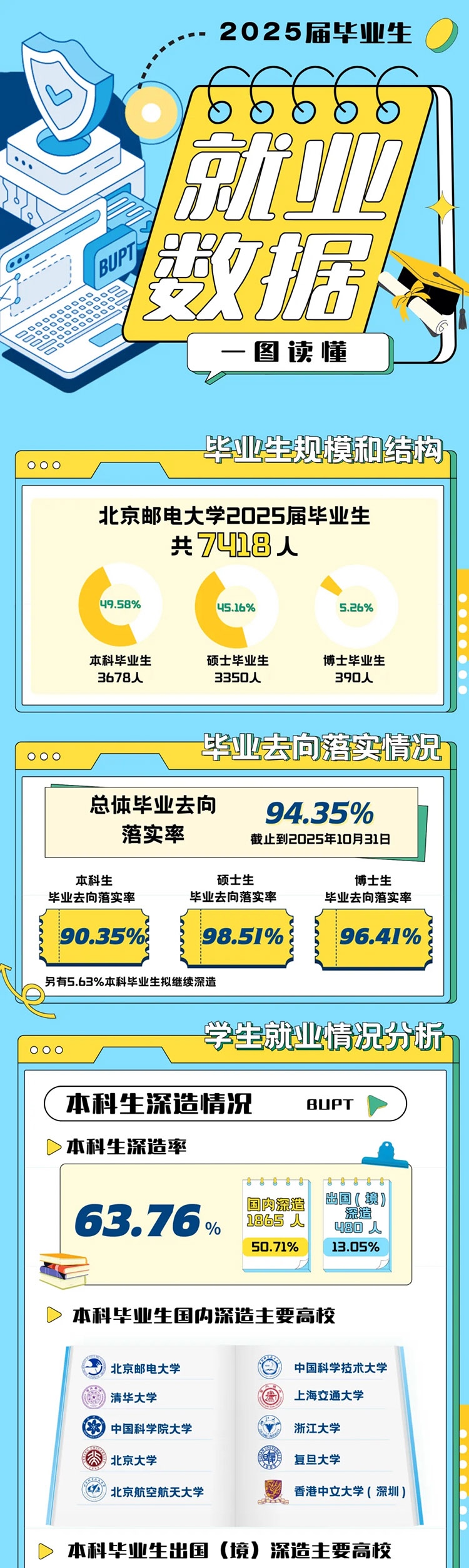 截至2025年10月31日,北京郵電大學(xué)總體畢業(yè)去向落實(shí)率為94.35%。其中本科畢業(yè)生去向落實(shí)率為90.35%,另有5.63%本科畢業(yè)生擬繼續(xù)深造。碩士畢業(yè)生去向落實(shí)率為98.51%,博士畢業(yè)生去向落實(shí)率為96.41%。