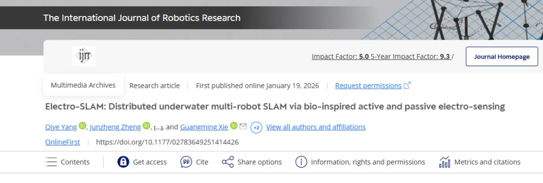 近日,北京大學(xué)先進(jìn)制造與機(jī)器人學(xué)院謝廣明團(tuán)隊(duì)在機(jī)器人領(lǐng)域國際頂級期刊The International Journal of Robotics Research(IJRR)上發(fā)表重要研究成果,提出Electro-SLAM——一種集成主動(dòng)與被動(dòng)電感知的分布式水下同步定位與建圖(SLAM)系統(tǒng)。該研究為復(fù)雜、黑暗及渾濁水域中的水下機(jī)器人自主感知與協(xié)同作業(yè)提供了全新解決方案。該期刊是機(jī)器人領(lǐng)域公認(rèn)的國際頂級學(xué)術(shù)期刊之一。該論文是北京大學(xué)作為第一完成單位在IJRR發(fā)表的首篇研究論文,標(biāo)志著學(xué)校在水下機(jī)器人與新型感知SLAM研究方向取得重要突破。