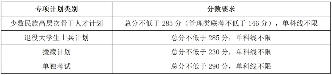 享受少數(shù)民族照顧政策考生:報(bào)名時(shí)工作單位和戶籍在國(guó)務(wù)院公布的民族區(qū)域自治地方,且定向就業(yè)單位為原單位的少數(shù)民族在職人員考生,在網(wǎng)上報(bào)名時(shí)按要求填報(bào)申請(qǐng)信息,我校復(fù)試前進(jìn)行資格審核,審核通過的考生,可按規(guī)定享受少數(shù)民族照顧政策。享受少數(shù)民族照顧政策復(fù)試基本分?jǐn)?shù)線總分不低于285分(管理類聯(lián)考不低于146分),單科要求均為30分(滿分=100分)、45分(滿分>100分)。報(bào)考專項(xiàng)計(jì)劃的考生,不再享受少數(shù)民族照顧政策。