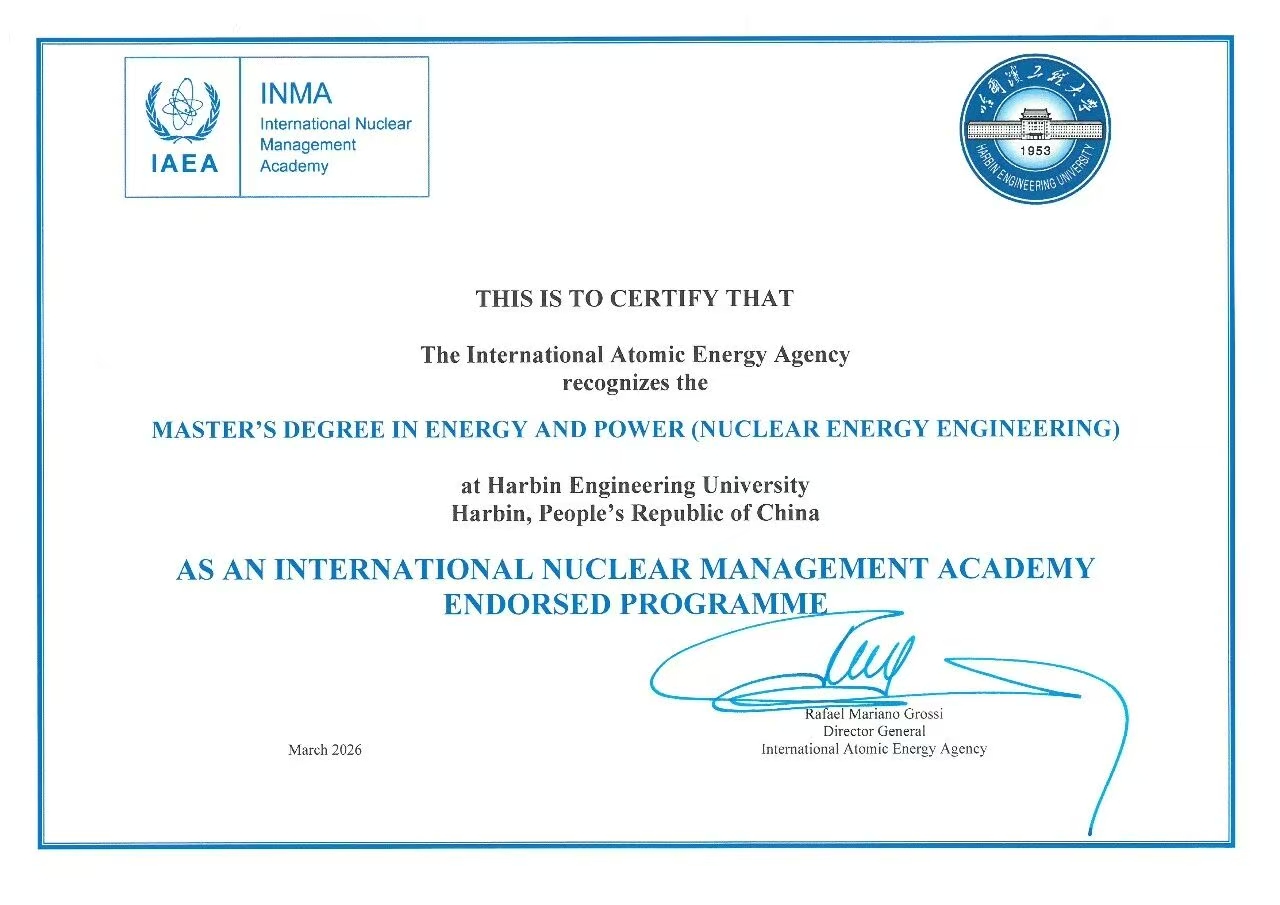 3月25日,國際原子能機構總干事拉斐爾·馬里亞諾·格羅西訪華,在國家原子能機構主任單忠德的見證下,向哈爾濱工程大學頒發(fā)國際核管理學院核技術管理碩士教育認證證書,校黨委副書記、校長殷敬偉代表學校接受證書。哈工程也成為國內首個獲得國際原子能機構國際核管理學院核技術管理碩士教育認證的高校。
