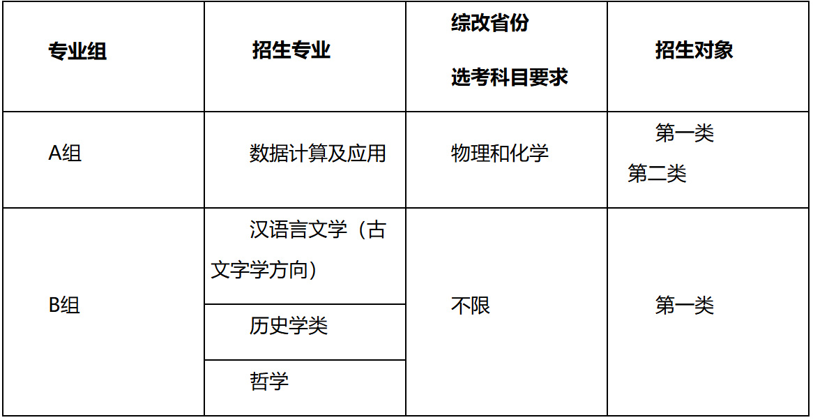 我校強(qiáng)基計(jì)劃招生專業(yè)為數(shù)據(jù)計(jì)算及應(yīng)用、漢語(yǔ)言文學(xué)(古文字學(xué)方向)、歷史學(xué)類、哲學(xué)??忌傻卿泩?bào)名系統(tǒng)查看我校2026年分省(區(qū)、市)強(qiáng)基計(jì)劃招生專業(yè)及招生計(jì)劃;第二類考生單列計(jì)劃。
