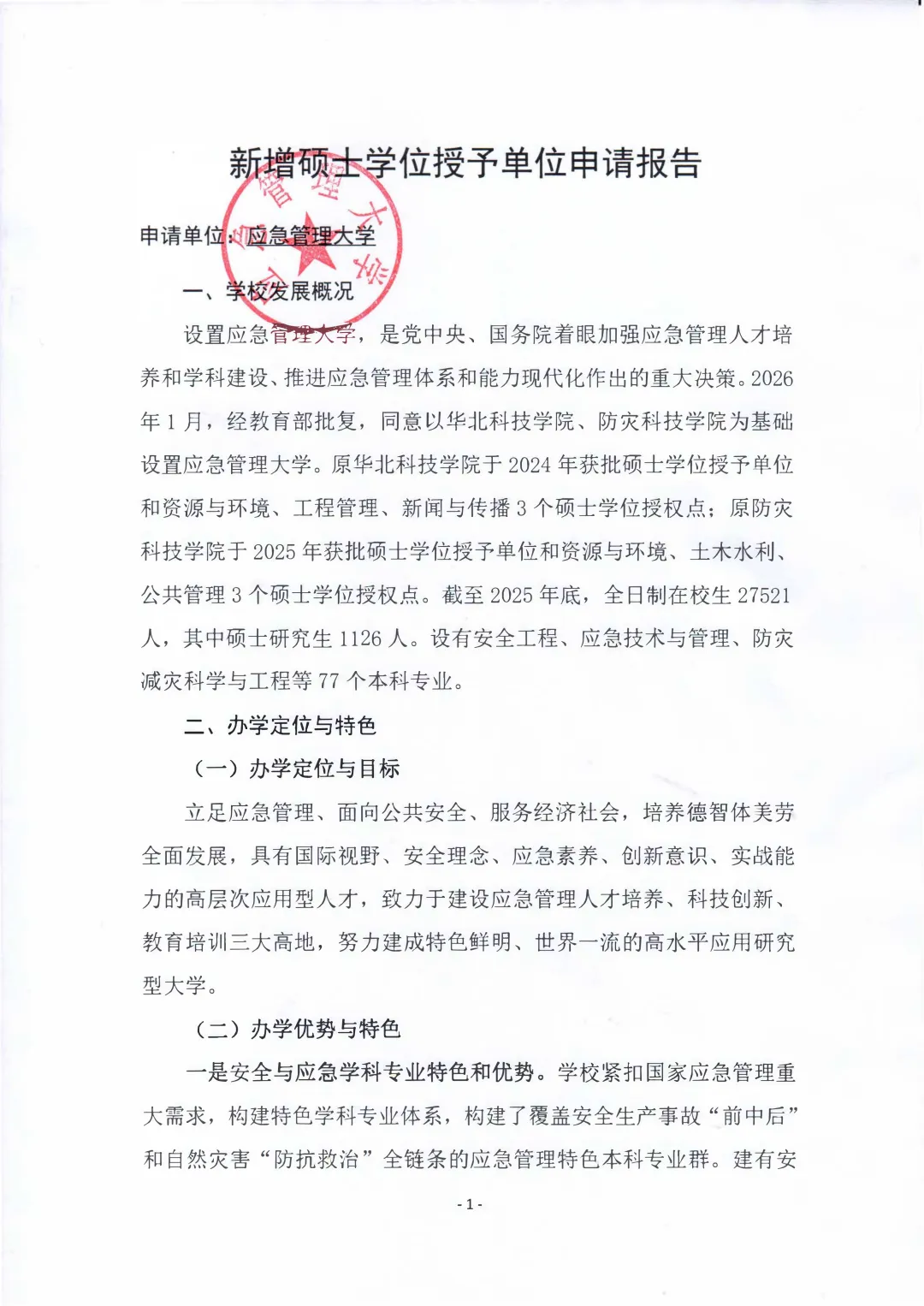 根據(jù)《國務院學位委員會關于印發(fā)<博士碩士學位授予資格審核辦法>的通知》(學位〔2025〕22號)要求,現(xiàn)將應急管理大學增設碩士學位授予單位和碩士學位授予點申請材料予以公示,公示期為5個工作日。