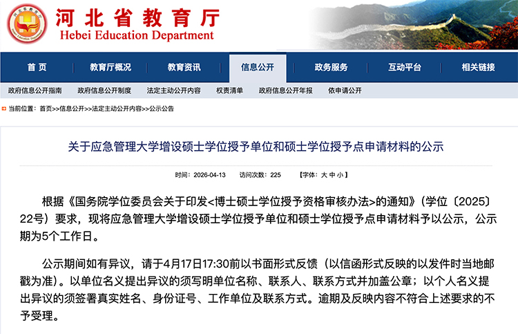 4月13日,河北省教育廳發(fā)布《關于應急管理大學增設碩士學位授予單位和士學位授予點申請材料的公示》。公示材料顯示,應急管理大學申請新增碩士學位授予單位和資源與環(huán)境、土木水利、工程管理、公共管理、新聞與傳播5個碩士專業(yè)學位授予點。