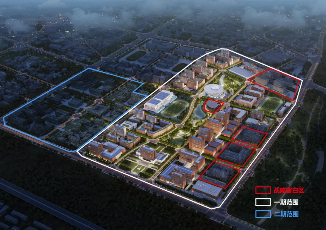 按照“整體規(guī)劃、分期建設(shè)”的思路,一期規(guī)劃用地面積700余畝,重點(diǎn)建設(shè)科研樓、教學(xué)樓、圖書(shū)館、體育館、學(xué)生宿舍、食堂/能源中心、操場(chǎng)等;二期規(guī)劃用地面積400余畝,重點(diǎn)布局產(chǎn)教融合、臨床研究相關(guān)平臺(tái)及機(jī)構(gòu)。