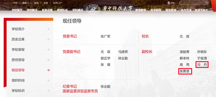7月5日,華中科技大學(xué)官網(wǎng)“現(xiàn)任領(lǐng)導(dǎo)”一欄更新,馮丹、張勇慧已任學(xué)校副校長(zhǎng)。