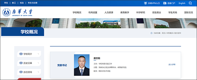 近日,南華大學(xué)官方網(wǎng)站“現(xiàn)任領(lǐng)導(dǎo)”一欄更新后顯示,唐忠陽(yáng)已任南華大學(xué)黨委書記,主持學(xué)校黨委全面工作。