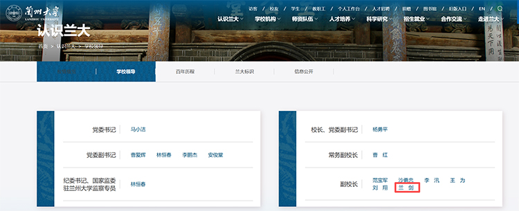 據(jù)蘭州大學官網(wǎng)“現(xiàn)任領(lǐng)導(dǎo)”一欄顯示,蘭劍已任該校副校長。