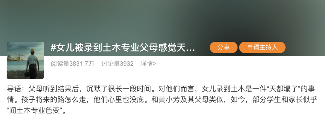 土木工程,又一次被推上風(fēng)口浪尖。近日,#女兒被錄到土木專業(yè)父母感覺天塌了#的話題引發(fā)廣泛討論,迅速登上熱搜榜。
