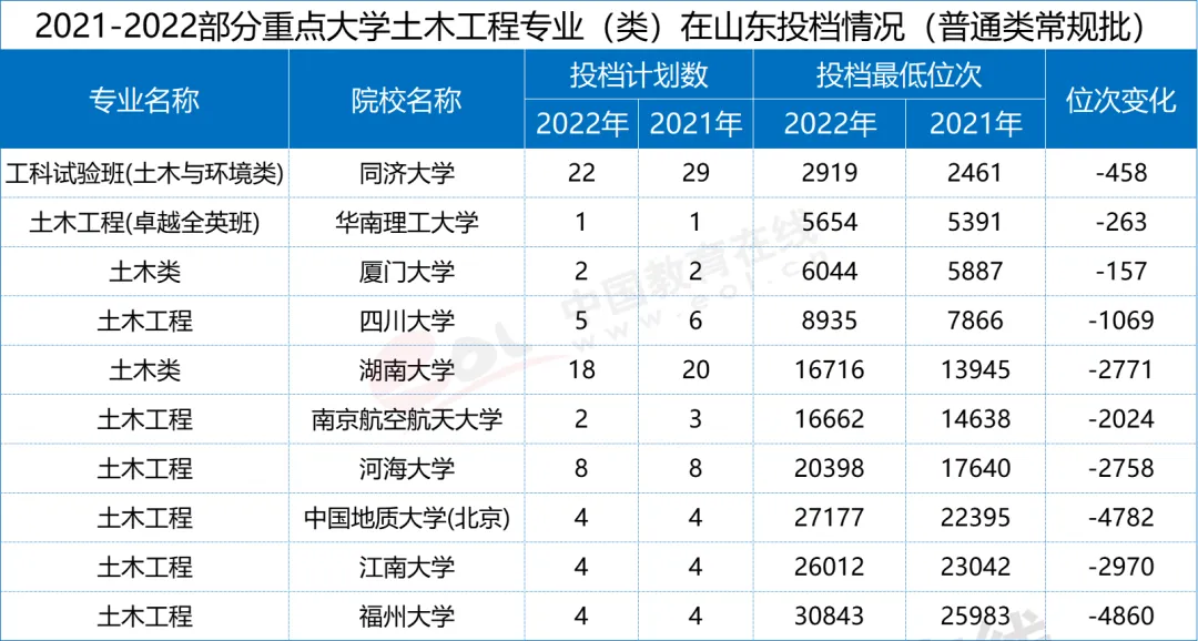 根據(jù)中國教育在線發(fā)布的《2023高招調(diào)查報告》,全國范圍大部分高校土木專業(yè)分數(shù)都出現(xiàn)了明顯的滑坡,錄取分數(shù)(位次)出現(xiàn)了不同程度的下跌。同濟大學(xué)在山東的錄取位次下跌了400多,中國地質(zhì)大學(xué)(北京)在招生總量未變的情況下,錄取考生的位次下跌了近5000個位次,四川大學(xué)與湖南大學(xué)則分別下跌1069和2771個位次。