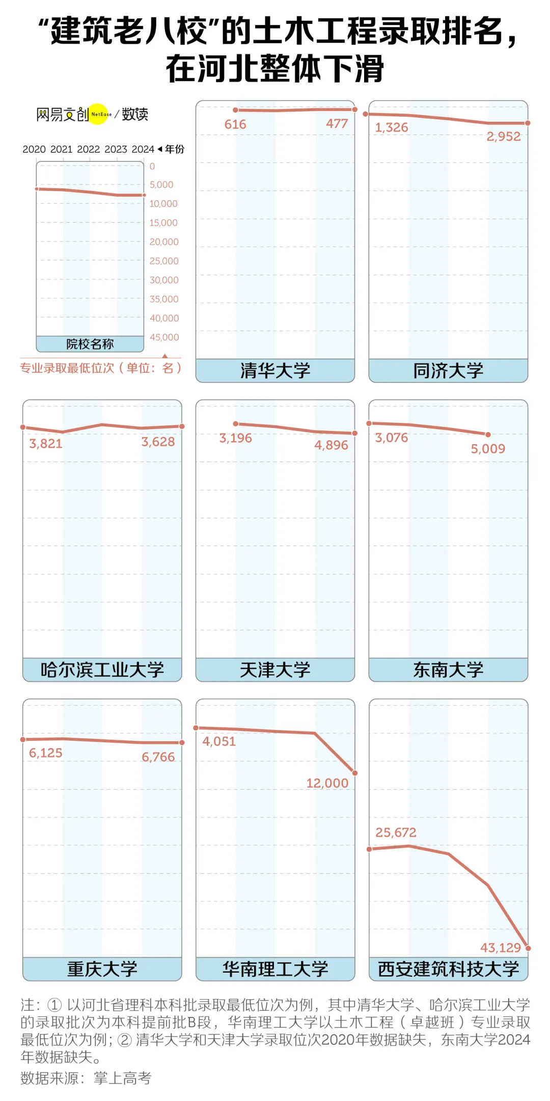 2020年以來,在土木業(yè)內(nèi)擁有重大影響力的“建筑老八校”在河北的高考錄取中,除了清華大學(xué)、哈工大的最低錄取名次在“悶聲”回升外,其他學(xué)校的錄取位次大多有所下跌。相較往年,2024年華南理工大學(xué)在河北的最低錄取位次掉落了近七千名,西安建筑科技大學(xué)更是暴跌一萬多名。