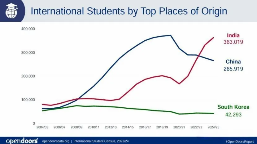 從全球看,留學(xué)規(guī)模仍在擴(kuò)大。《2025年美國門戶開放報(bào)告》顯示,赴美留學(xué)生總數(shù)增長4.5%,達(dá)到117萬人的歷史高位。但與此同時,中國赴美留學(xué)生人數(shù)卻下降至26.59 萬人,連續(xù)5年下滑,與印度等國的差距進(jìn)一步拉大。