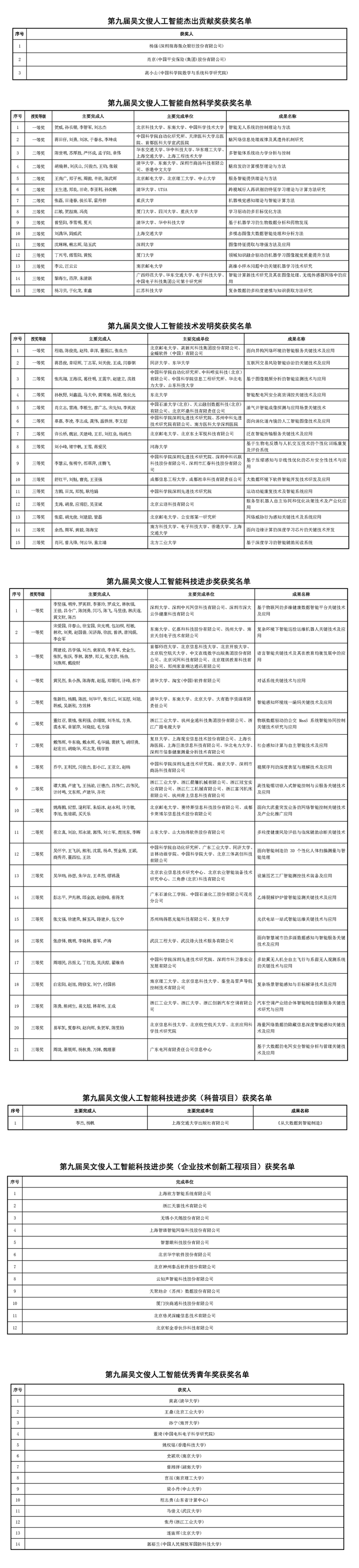 經(jīng)吳文俊人工智能科學(xué)技術(shù)獎勵委員會審核同意,報中國人工智能學(xué)會理事長批準(zhǔn),現(xiàn)將第九屆吳文俊人工智能科學(xué)技術(shù)獎獲獎名單在中國人工智能學(xué)會官網(wǎng)(www.caai.cn)、吳文俊人工智能科學(xué)技術(shù)獎官網(wǎng)(www.wuwenjunkejijiang.cn)進(jìn)行公示,接受社會監(jiān)督。自公示之日起2019年10月11日—20日為異議期。在此期間,任何單位和個人對獲獎成果內(nèi)容的真實性持有異議,請以實名并書面形式向吳文俊人工智能科學(xué)技術(shù)獎辦公室提出意見和證明材料,凡匿名和超出規(guī)定時間的異議不予受理。