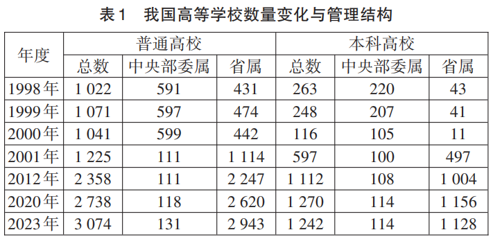 1998年,國(guó)務(wù)院機(jī)構(gòu)改革,調(diào)整撤并了9個(gè)工業(yè)部門,采用“共建、調(diào)整、合作、合并”的八字方針,對(duì)其所屬的91所普通高校、72所成人高校和202所中等專業(yè)學(xué)校實(shí)行了“中央與地方共建,以地方管理為主”的體制調(diào)整,從根本上改變了計(jì)劃經(jīng)濟(jì)時(shí)期形成的“條塊分割、部門辦學(xué)”的局面,推動(dòng)高等教育管理走向“三級(jí)辦學(xué)、兩級(jí)管理、以省為主”。我國(guó)高等教育逐漸走向中央和省級(jí)政府兩級(jí)管理、以省級(jí)政府管理為主的新型管理體制。
