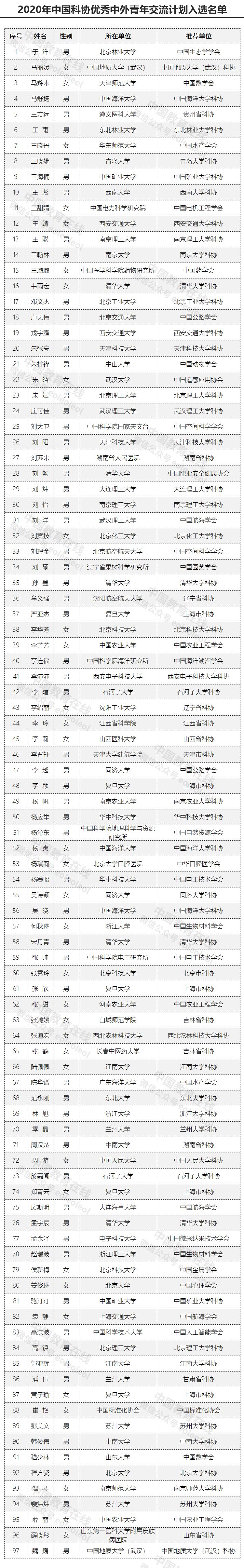 為深入貫徹習(xí)近平新時代中國特色社會主義思想和習(xí)近平總書記關(guān)于科技創(chuàng)新、人才工作、青年工作重要指示精神,推進(jìn)國際科技交流合作,助力青年科技人才成長成才,中國科協(xié)設(shè)立“中國科協(xié)優(yōu)秀中外青年交流計(jì)劃”(以下簡稱“青年交流計(jì)劃”),旨在圍繞國家重大戰(zhàn)略需求,支持青年科技人才赴國外大學(xué)、研究機(jī)構(gòu)、實(shí)驗(yàn)室、國際知名科技企業(yè)和國際科技組織開展短期訪問、交流,與國際同行共同開展學(xué)術(shù)研究,促進(jìn)青年科技人才走近國際科技前沿,拓寬國際科技視野,把握世界科技大勢,打造高層次科技創(chuàng)新人才后備隊(duì)伍。經(jīng)推薦申報、形式審查、專家評審等環(huán)節(jié),2020年“青年交流計(jì)劃”共確定資助97名入選者。