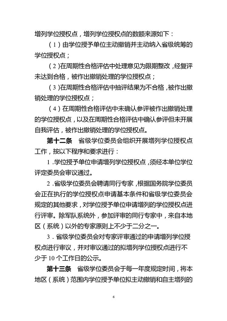 2013年,國務(wù)院學(xué)位委員會(huì)第30次會(huì)議審議通過了《關(guān)于開展博士、碩士學(xué)位授權(quán)學(xué)科和專業(yè)學(xué)位授權(quán)類別動(dòng)態(tài)調(diào)整試點(diǎn)工作的意見》,建立了學(xué)位授權(quán)點(diǎn)“總量不變,有上有下”的動(dòng)態(tài)調(diào)整制度,并于2014年啟動(dòng)了試點(diǎn)工作。2015年,在總結(jié)試點(diǎn)工作經(jīng)驗(yàn)的基礎(chǔ)上,印發(fā)了《博士、碩士學(xué)位授權(quán)學(xué)科和專業(yè)學(xué)位授權(quán)類別動(dòng)態(tài)調(diào)整辦法》(以下簡稱《辦法》),并決定自2016年起,學(xué)位授權(quán)點(diǎn)動(dòng)態(tài)調(diào)整的范圍擴(kuò)大到全國。經(jīng)過6年的實(shí)施,各單位累計(jì)撤銷博士、碩士學(xué)位授權(quán)點(diǎn)1600余個(gè),增列博士、碩士學(xué)位授權(quán)點(diǎn)1000余個(gè),對(duì)引導(dǎo)學(xué)位授予單位主動(dòng)優(yōu)化學(xué)科專業(yè)結(jié)構(gòu)、提升研究生教育質(zhì)量發(fā)揮了重要作用。