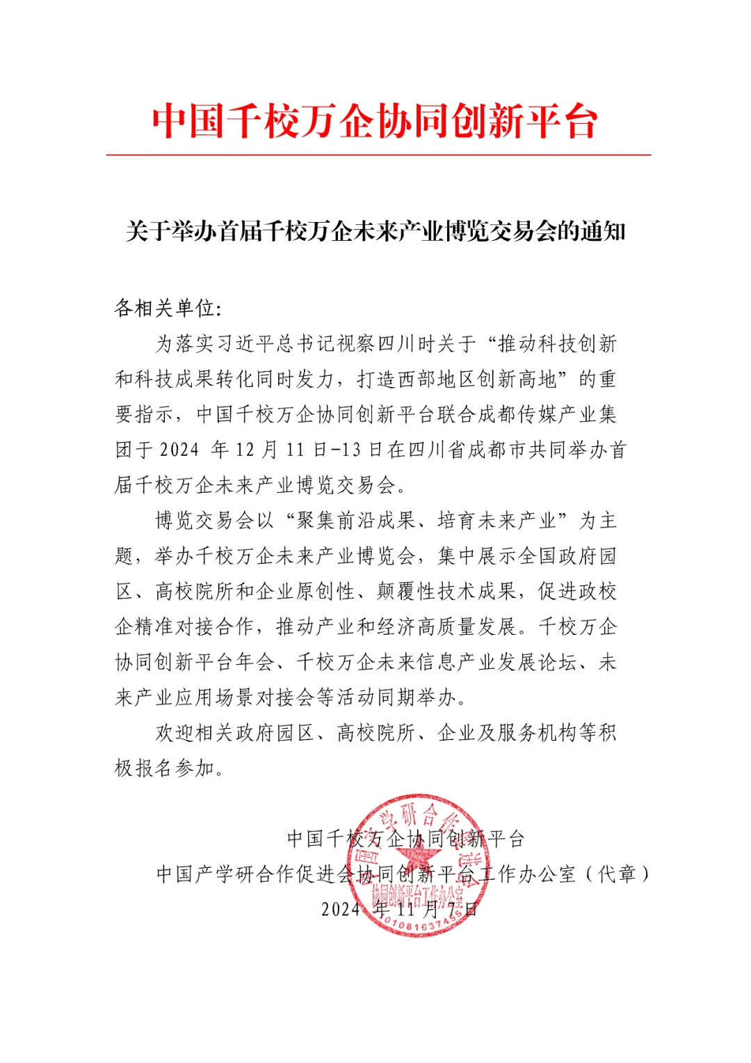 為落實(shí)習(xí)近平總書記視察四川時(shí)關(guān)于“推動(dòng)科技創(chuàng)新和科技成果轉(zhuǎn)化同時(shí)發(fā)力,打造西部地區(qū)創(chuàng)新高地”的重要指示,中國千校萬企協(xié)同創(chuàng)新平臺(tái)聯(lián)合成都傳媒產(chǎn)業(yè)集團(tuán)于2024年12月11日-13日在四川省成都市共同舉辦首屆千校萬企未來產(chǎn)業(yè)博覽交易會(huì)。