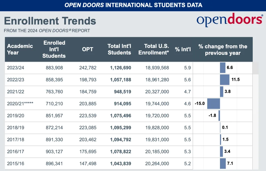 根據(jù)Open Doors 2024最新數(shù)據(jù),2023/2024學年在美國留學的國際學生數(shù)量達1126690人,同比增長6.6%,創(chuàng)造歷史最高紀錄。