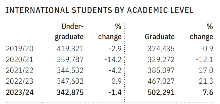 在學術層次方面,本科留學生人數(shù)為342,875人,略有下降;而研究生人數(shù)則達到502,291人,同比增長7.6%,顯示出越來越多國際學生傾向于赴美攻讀研究生學位。