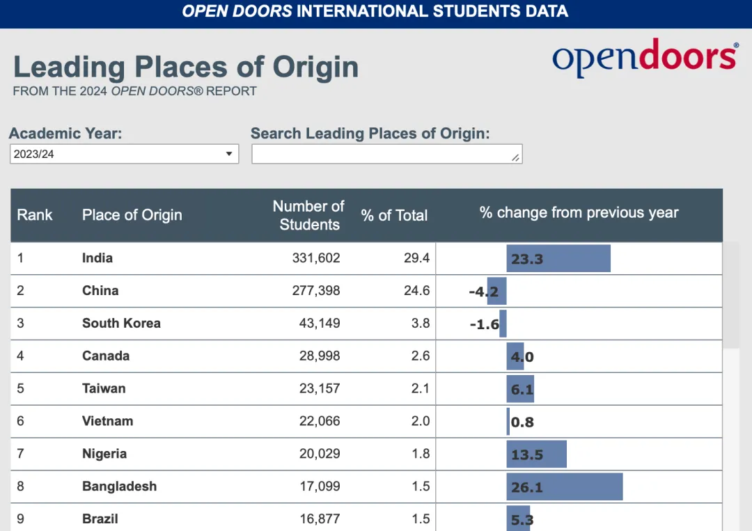 報告數(shù)據(jù)顯示,2023/24學年共有277,398名中國大陸留學生在美國就讀,同比下降4.2%,而來自印度的留學生人數(shù)達到了331,602人,中國是美國第二大的留學生群體生源地。