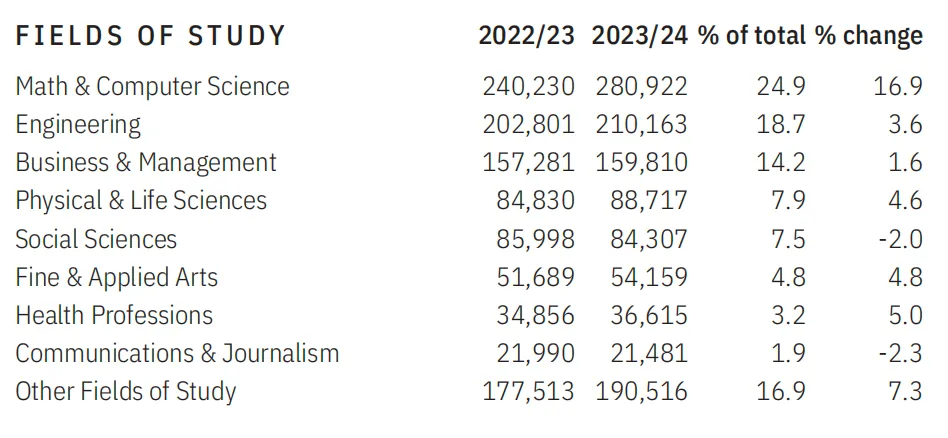 在專業(yè)選擇方面,數(shù)學與計算機科學專業(yè)依舊是國際學生的首選,共有280,922人就讀,其次是工程類專業(yè),共計210,163人。商業(yè)與管理專業(yè)也廣受歡迎,就讀人數(shù)達到159,810人。STEM領域的留學熱度持續(xù)升溫,占據(jù)了整體國際學生群體中的半壁江山。