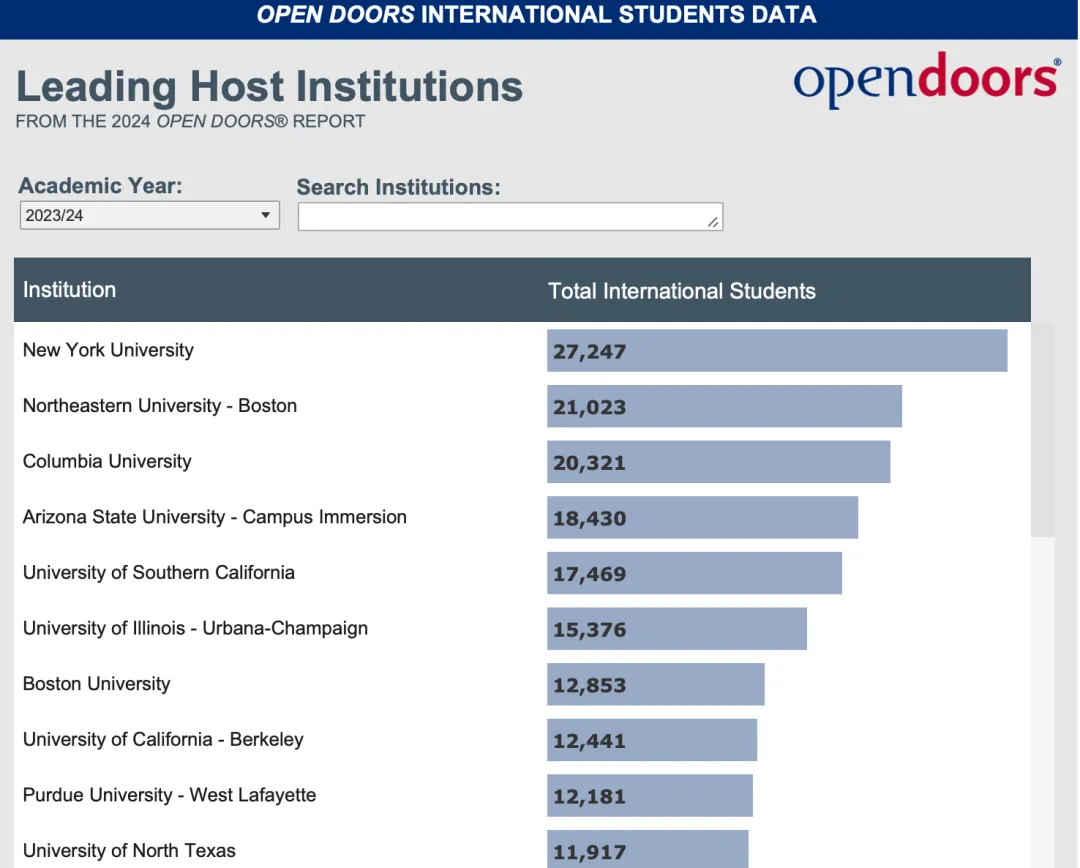 紐約大學以27,247名國際學生繼續(xù)穩(wěn)居榜首,成為最受歡迎的院校。緊隨其后的是東北大學波士頓校區(qū)、哥倫比亞大學、亞利桑那州立大學和南加州大學等。